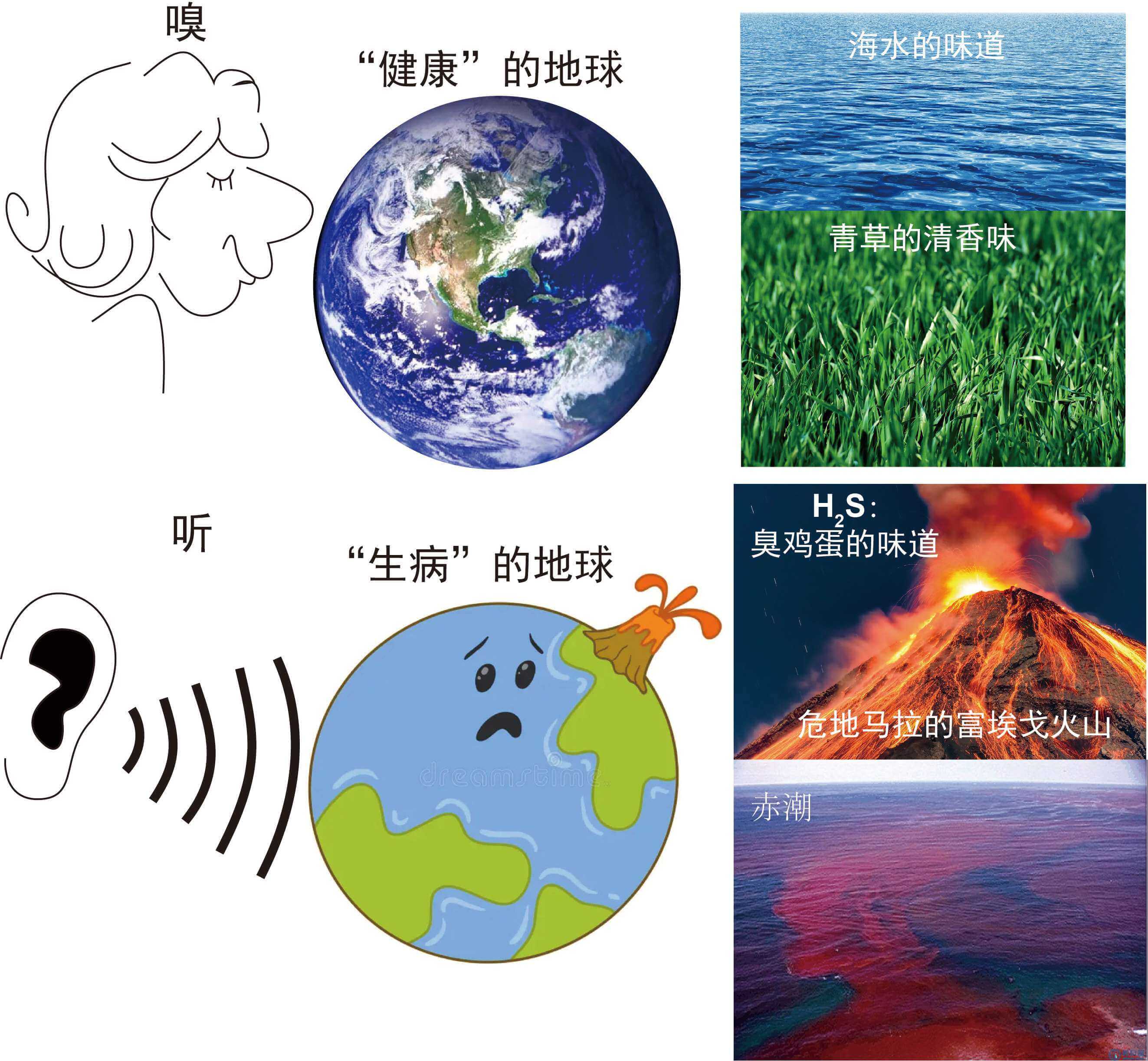 用鼻子嗅一嗅地球,会闻到什么味儿呢?有各种花朵的花香味(如玫瑰花、茉莉花、栀子花等)、水果的果香味(如苹果、芒果、百香果、榴莲等)、香料的香味、青草的清香味(图2);还有下雨时大地散发的“土腥味”。这些都是健康的味道。当地球“不适”时,味道就变了。海洋的腥臭,是水体富营养化的“警告”;刺鼻的硫磺味(臭鸡蛋味),是火山这位“地球的内火”正在“上火”的明确信号(图2),这犹如人体内火旺盛发出的口臭味。