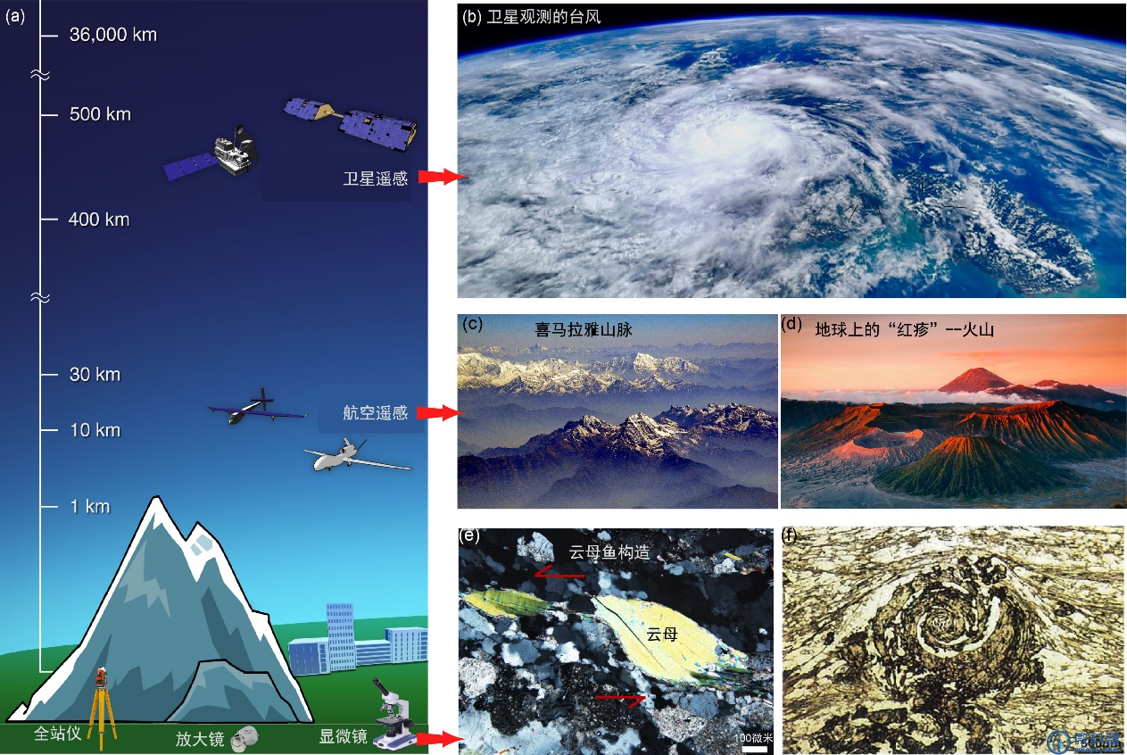 (a)“望诊”地球的不同手段;(b)卫星观测的台风;(c)航空拍摄的喜马拉雅山脉;(d)地球上的“红疹”—火山(图片来源https://yandex.com/images/);(e)显微镜下的云母鱼构造;(f)显微镜下的雪球构造。