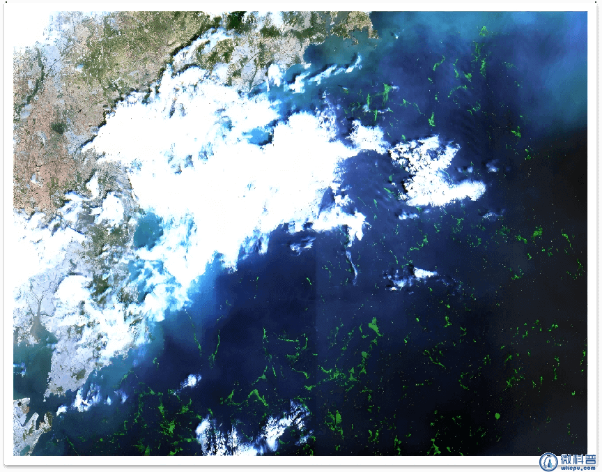 图6 黄东海大量的浒苔,透过薄云依然可见