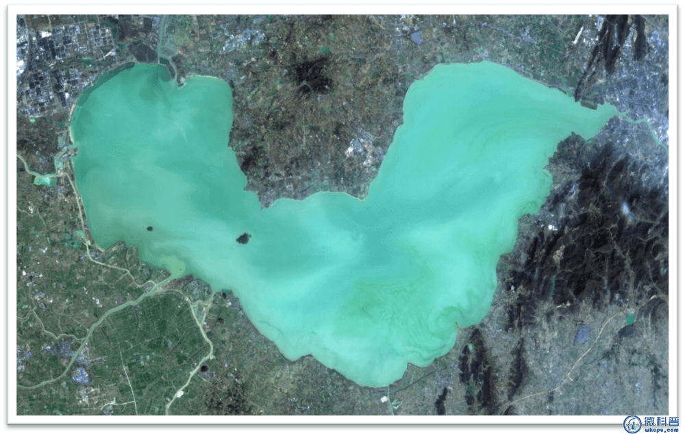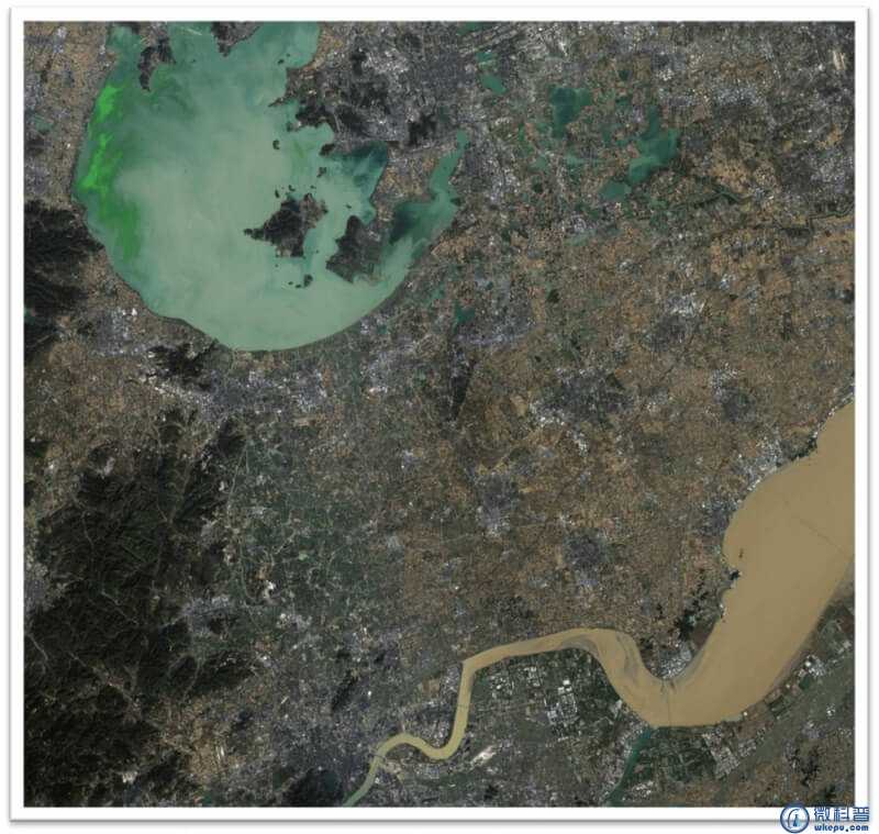 图7 太湖与杭州湾一角;太湖西部藻华与杭州湾的高浓度悬浮泥沙反差强烈