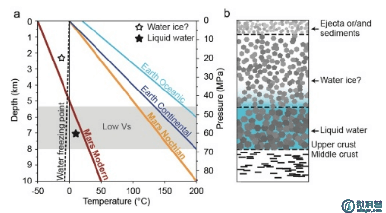 由多国科学家组成的团队(包括中国科学院地质与地球物理研究所的研究人员)分析地震波传播特征后,在火星地壳5.4-8公里深度发现了一个显著的横波低速层。横波(S波)无法在液体中传播,但其在部分饱和的孔隙介质中速度会明显降低。该深度区间的温度(估计在0-25°C之间)已超过水的冰点,结合其他地球物理数据,最合理的解释是存在液态水充填的孔隙介质。