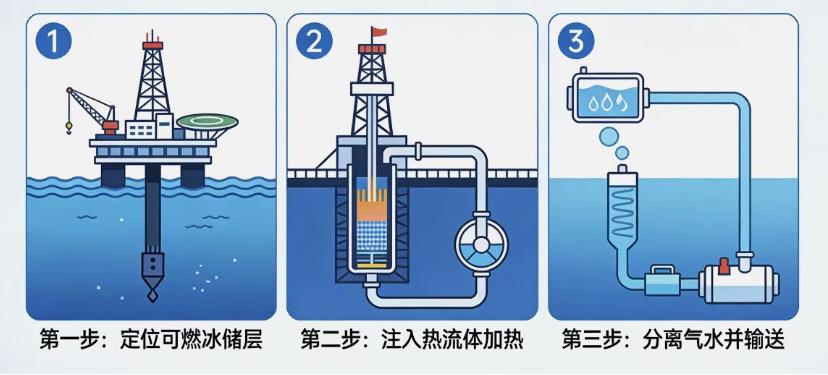 第一种是降压法,主要通过降低海底压力,从而让可燃冰自动分解。这是目前最成熟、最稳定的技术,也是我国在南海试采时使用的主力技术。