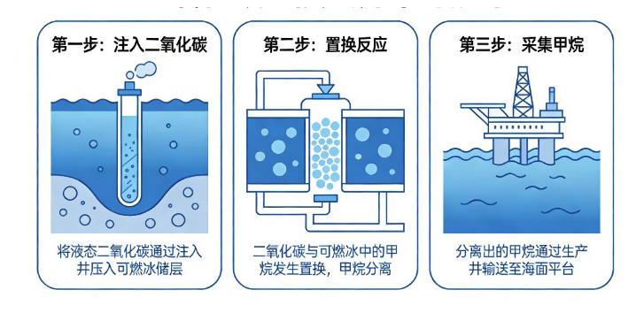 第三种是二氧化碳置换法,把二氧化碳注入可燃冰层,由于它比甲烷更易与水分子结合,于是原本被锁在冰里的甲烷就会被“挤”出来,变成可以收集的天然气。这也是目前最环保的方法。