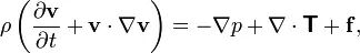 v 是流体速度,▽是拉普拉斯算子;ρ是流体密度;p 是压力,T=μ▽v 是应力张量,μ是粘性系数,f 是体力。