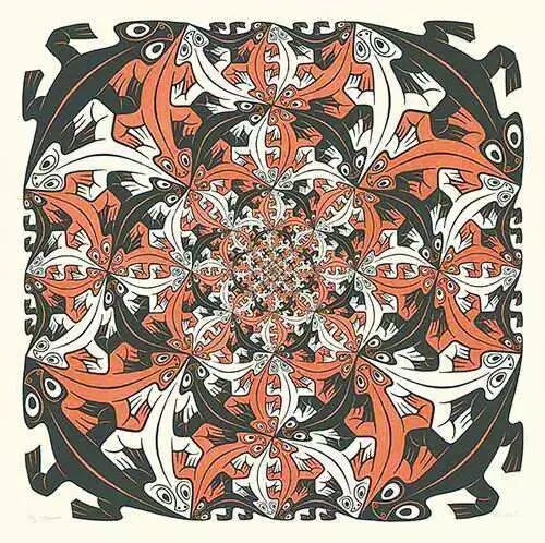埃舍尔他画过很多极限图,上面的图是典型的两幅。它们分别通过一个圆形和一个方形,用动物的形象(埃舍尔最喜欢画的动物鱼和蜥蜴)越变越小,分别收敛到边缘和中心。因为在二维空间里,极限一般是一个二维空间里的一维曲线,也可能退化到一个点。在左图中极限是圆边周,在右图中极限是中心点。
