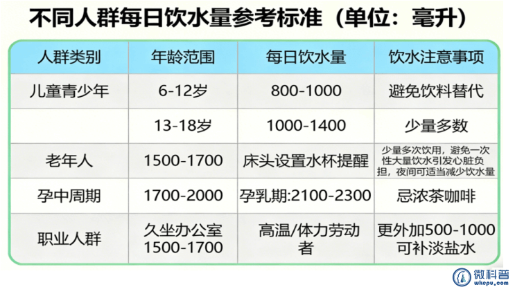 - 儿童青少年:正处于生长发育关键期,代谢旺盛,建议按年龄调整——6-12岁每天800-1000毫升,13-18岁每天1000-1400毫升,避免用饮料代替白开水,否则可能影响骨骼发育和体重管理。