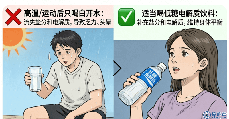 4. 误区四:高温天只喝白开水——高温环境或剧烈运动后出汗多,不仅会流失水分,还会带走盐分和电解质,只喝白开水可能导致电解质失衡,出现乏力、头晕等症状。健康人群优先通过香蕉、土豆、坚果等食物补充电解质,无需额外喝高糖电解质饮料,仅在出汗极多的情况下,可适当喝淡盐水或低糖电解质饮料(慢性肾病患者需遵医嘱)。