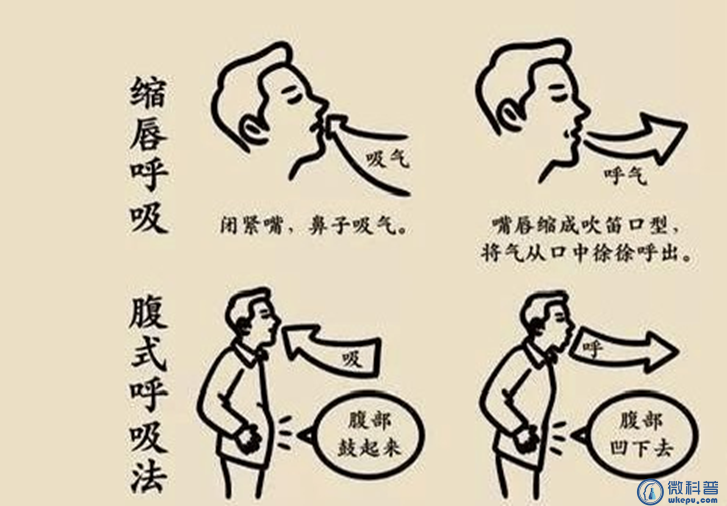 1. 腹式呼吸:通过膈肌运动增加肺通气量,改善呼吸困难。