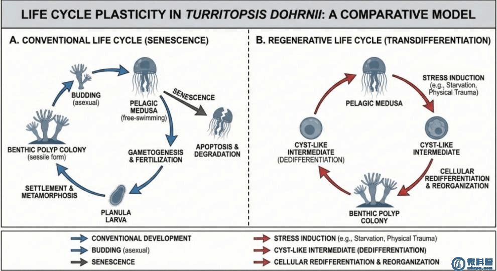 图2. 水母常规生命周期与再生生命周期的模式对比