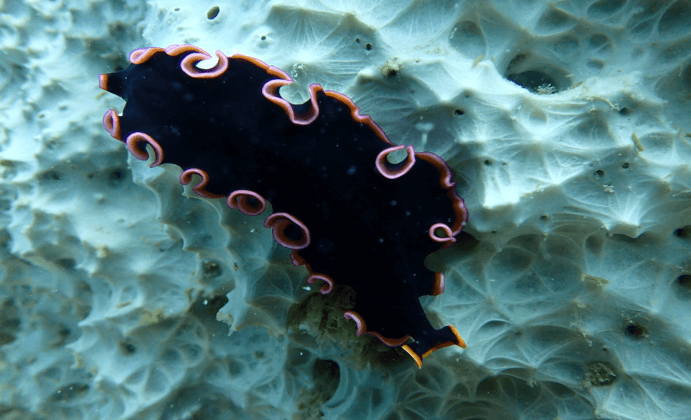 海扁虫是扁形动物门软扁虫科的成员,它们的身体极度扁平,外观虽然与常见的海蛞蝓(海兔)相似,事实上,很多人会把海扁虫和同样好看的海蛞蝓搞混,但它俩亲戚关系差得可远了!海扁虫是比海蛞蝓更原始的动物,它脑袋上具有两个仅有感光功能的眼点,算是个“近视眼”。它全身就一个开口,吃饭、拉粑粑都用那个开口,而且没有复杂的呼吸和循环系统,如此看来,海扁虫简单得不可思议!