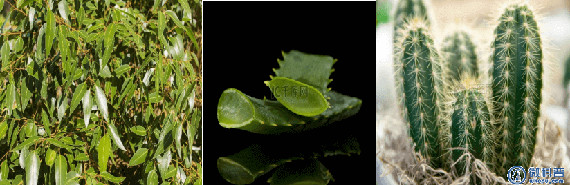 相对“开源”而言,“节流”同样是植物面对干旱逆境时的重要策略。植物的水分大多通过叶片表面的气孔以水蒸气的形式蒸腾,一些植物则会通过改变叶片形态的方式,减少蒸腾作用,达到“节流”效果。以桉树为代表的桉属植物在叶片表面进化出一层蜡质,保水抗紫外线;一些生长在季风气候地区的多肉植物如芦荟、龙舌兰等,则将叶片进化出储水功能,雨季时吸水供旱季使用;而仙人掌则更为极端,直接将叶片退化为刺,最大程度上减少水分蒸腾。