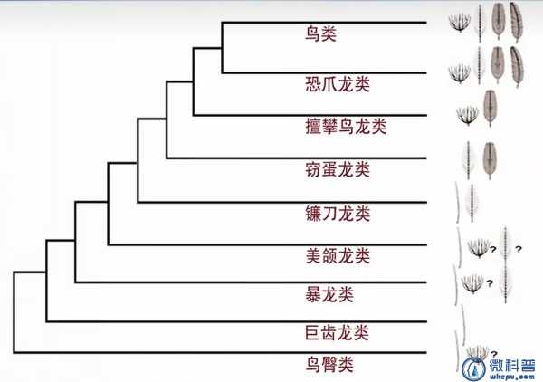 这个理论刚开始提出的时候有很多学者表示认同,但是缺乏有力证据。1861年在德国发现的始祖鸟(是连接爬行动物与鸟类的过渡物种)化石,在它的身上已经发展出了飞羽,也就是羽毛的最后形态。近年来,在我国辽宁西部、河北北部和内蒙古东南部中生代地层发现了一系列带羽毛恐龙化石,也为揭秘羽毛的宏观演化提供了诸多证据。1996年,科学家在中国辽宁发现了第一块长羽毛的恐龙化石,就是著名的中华龙鸟。中华龙鸟是现代科学家公认的鸟类的祖先。中华龙鸟的身上带有细丝状羽毛,也就是说羽毛的第二阶段形态在恐龙身上发现了。在这以后,科学家们在辽宁地区发现了越来越多的带羽毛的恐龙化石。不仅小型的恐龙化石带有羽毛,有些巨型恐龙的身体上也长有羽毛。经过对比发现,不同的恐龙长着不同的羽毛,同一种恐龙身上也长着不同的羽毛,可以表明,这个时期恐龙身上的羽毛是各种各样的。邹氏尾羽龙的身上已经出现了对称的羽片,还有赵氏小盗龙,这种恐龙在四肢上都覆盖了不对称的飞羽,相当于是有四个翅膀的兽脚类恐龙,还有赫式近鸟龙,它有绒毛状的体羽,四肢也覆盖了飞羽,还有明显的羽冠,它生活在1.6亿年前,比始祖鸟还要早1000万年。如果把这些羽毛的形态放在一个演化树上就会发现,从恐龙演化的早期到鸟类起源的过程当中,羽毛变得越来越复杂,越来越像现代鸟类的羽毛。这些有羽毛的恐龙们能够证明羽毛发育理论是对的,五个阶段的羽毛都在恐龙身上出现过。