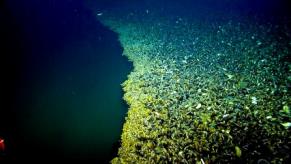 上图正是潜水器拍摄的深海盐水池边缘:左侧是沙质海底,右侧是高密度盐水,二者交界处形如航拍视角下的海岸线。这些盐水池分布于海洋深处,规模不一,小至直径几十米,大者可绵延二十公里。