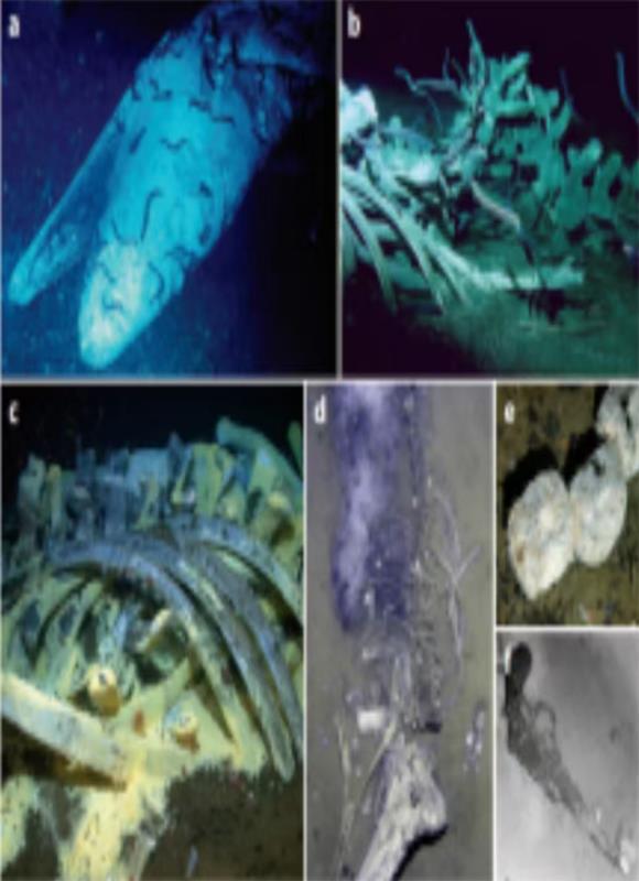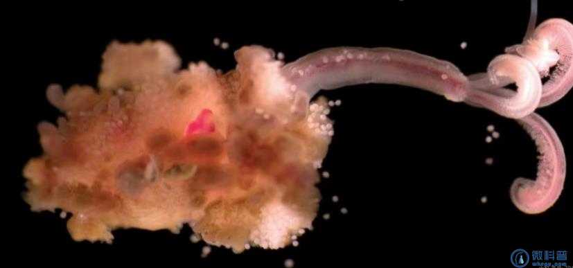 图2:食骨蠕虫(Osedax)——这类奇特的生物在化能自养阶段钻进鲸骨,依靠共生细菌分解骨骼获取养分,是鲸落专性物种的代表。