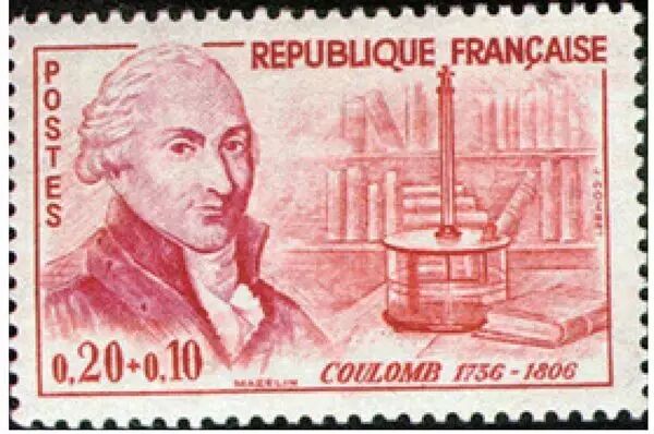 库仑是法国工程师和物理学家,在电学研究方面做出了重大贡献,被誉为“电磁学中的牛顿”。他出生在法国南部昂古列姆城一个富裕的家庭。1806 年8月23 日,库仑在巴黎逝世,终年70 岁。库仑为人正直,品质高尚。托马斯• 杨(T.Young,1773-1829)称赞库仑的道德品质是同他的数学研究一样出色。在纪念库仑发行的邮票(图2)中也有丰富的物理学史资料。人们可以看到库仑的肖像以及其生卒年代,可以看到他原来使用的扭秤。