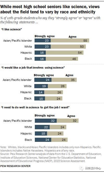 报告显示,尽管绝大多数高三学生喜欢科学,他们对该领域观点存在种族和族群差异。12年级学生(相当于高中三年级)中表示他们“强烈赞同”或“赞同”以下观点的比例为: