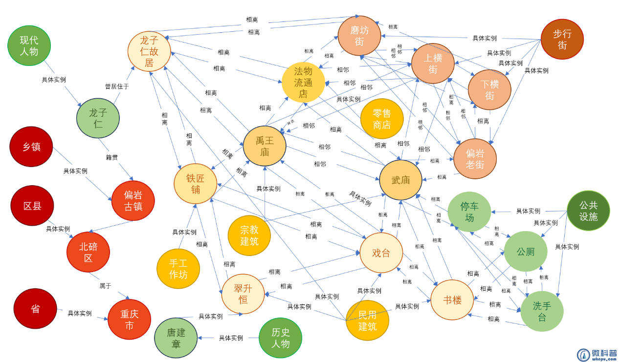 想象一下,如果给古镇里的每座桥、每栋老房子、每棵古树都建立一张“数字身份证”,上面不仅记录它们的基本信息,还能展示它们和其他事物的联系。比如,这座桥是谁建的?那棵古树见证了哪些历史事件?这座老房子为什么能屹立几百年不倒?这些“数字身份证”组合在一起,就形成了一个庞大的“数字族谱”,这就是知识图谱,如图 2所示。